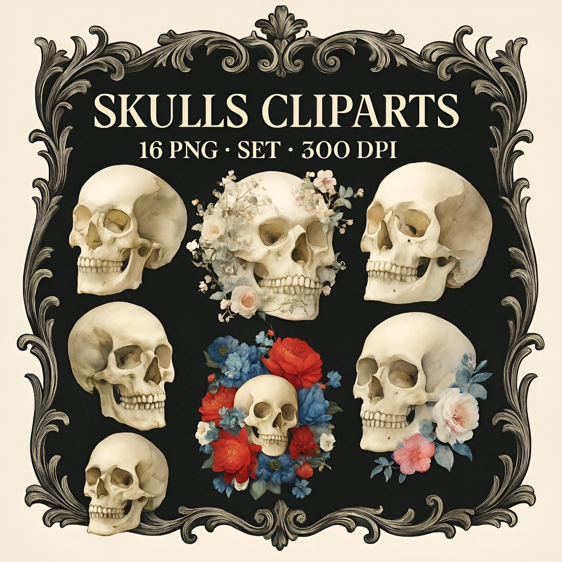 Bring creativity and charm to your projects with this beautiful Watercolor Skull Clipart Set β 16 PNG β Transparent Background β Watercolor Halloween Graphics β High Resolution 300 DPI Clipart Set. Each element is crafted in a realistic watercolor style to add elegance, magic and a handmade feel to your work.