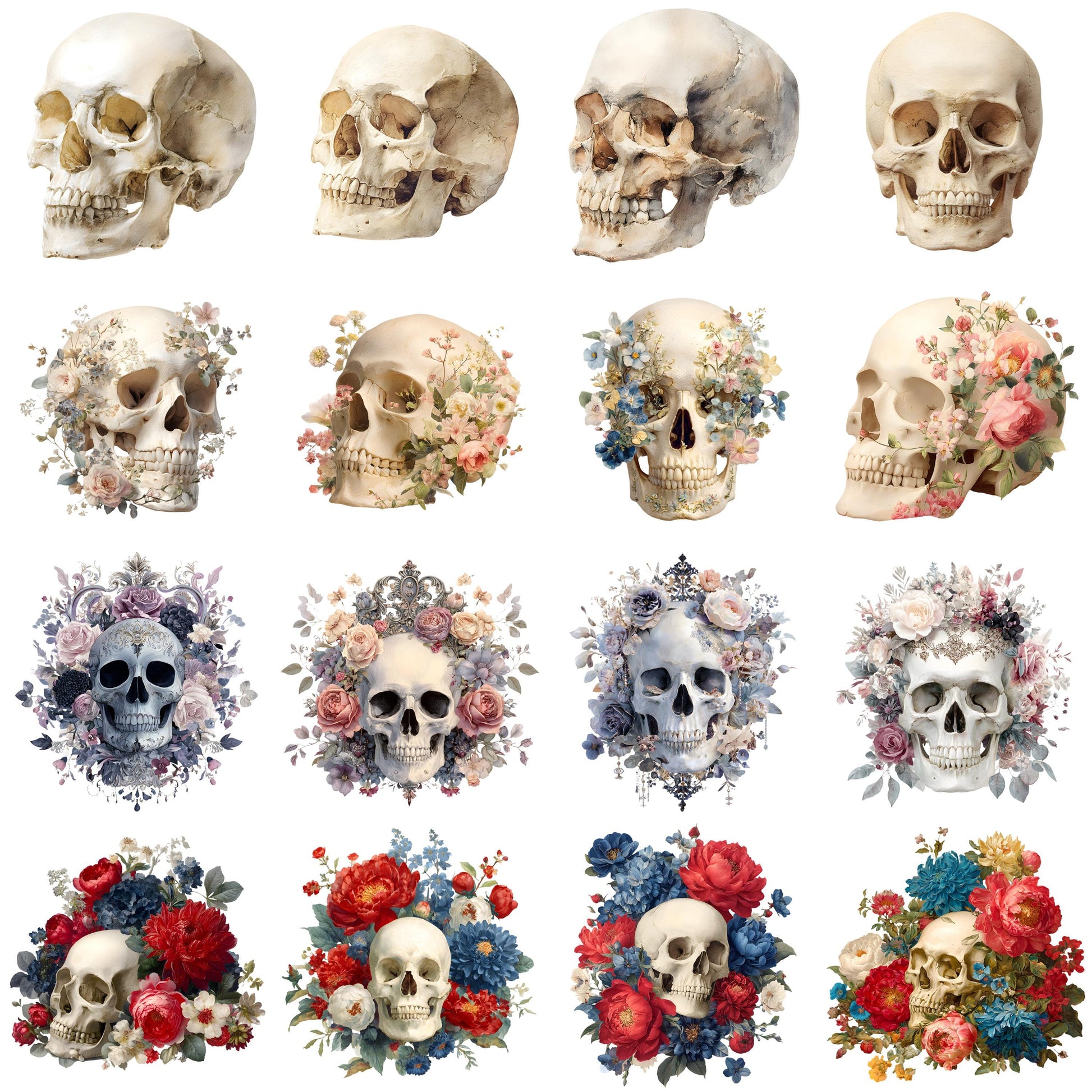Skull Clipart Set β 16 PNG β Transparent Background β Watercolor Halloween Graphics β High Resolution 300 DPI