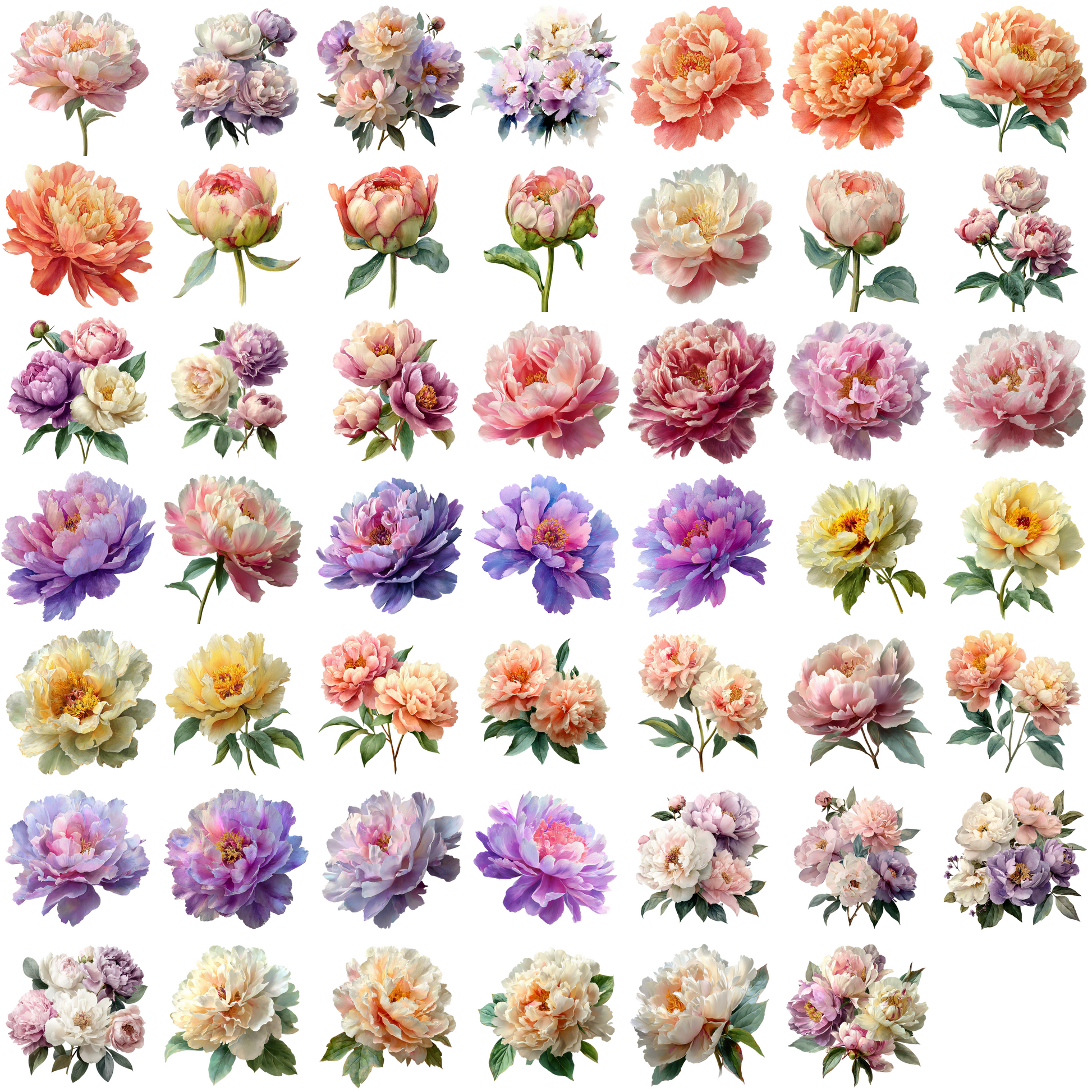 Watercolor Peonies Clipart Set: 48 PNG Designs with Transparent Background (Digital Download)