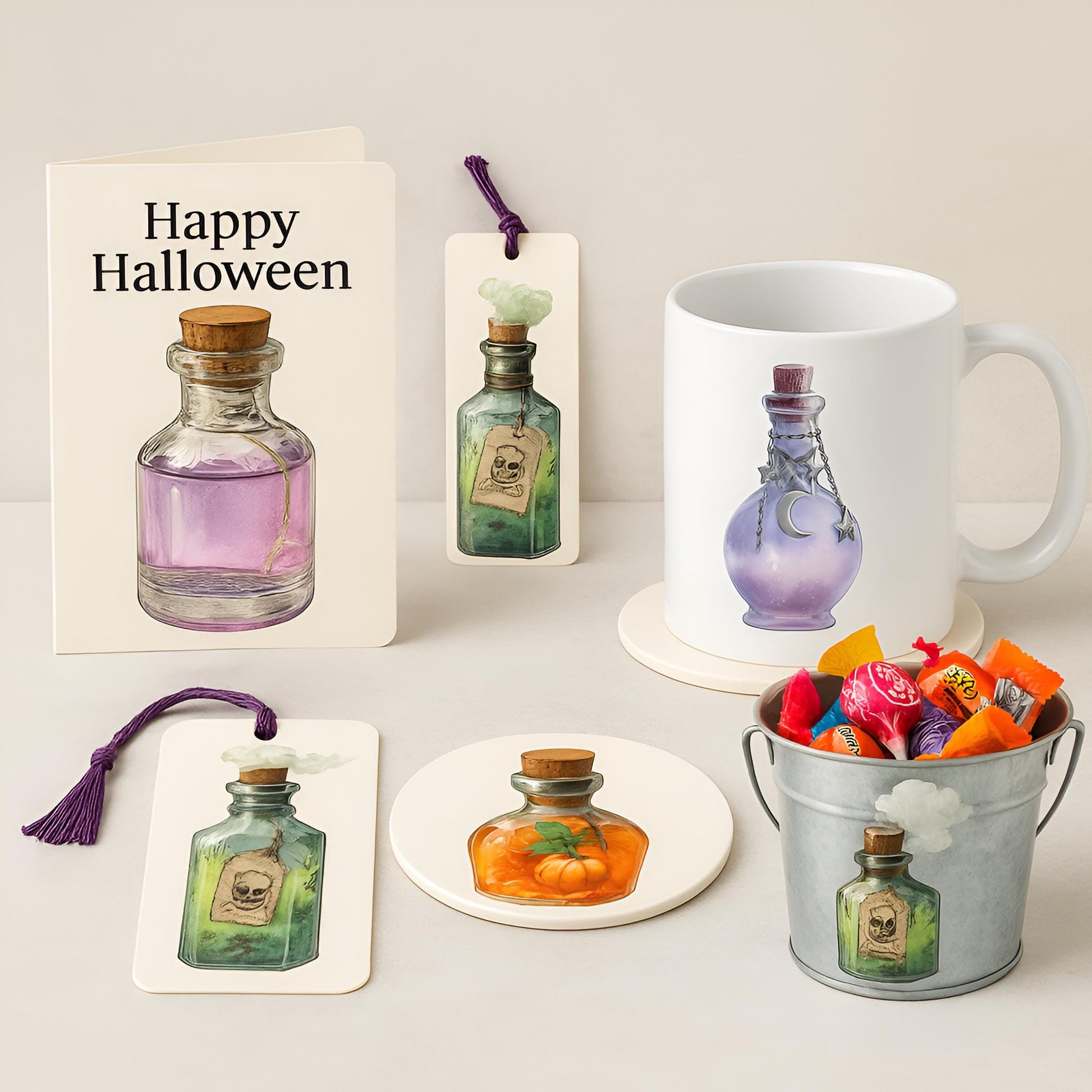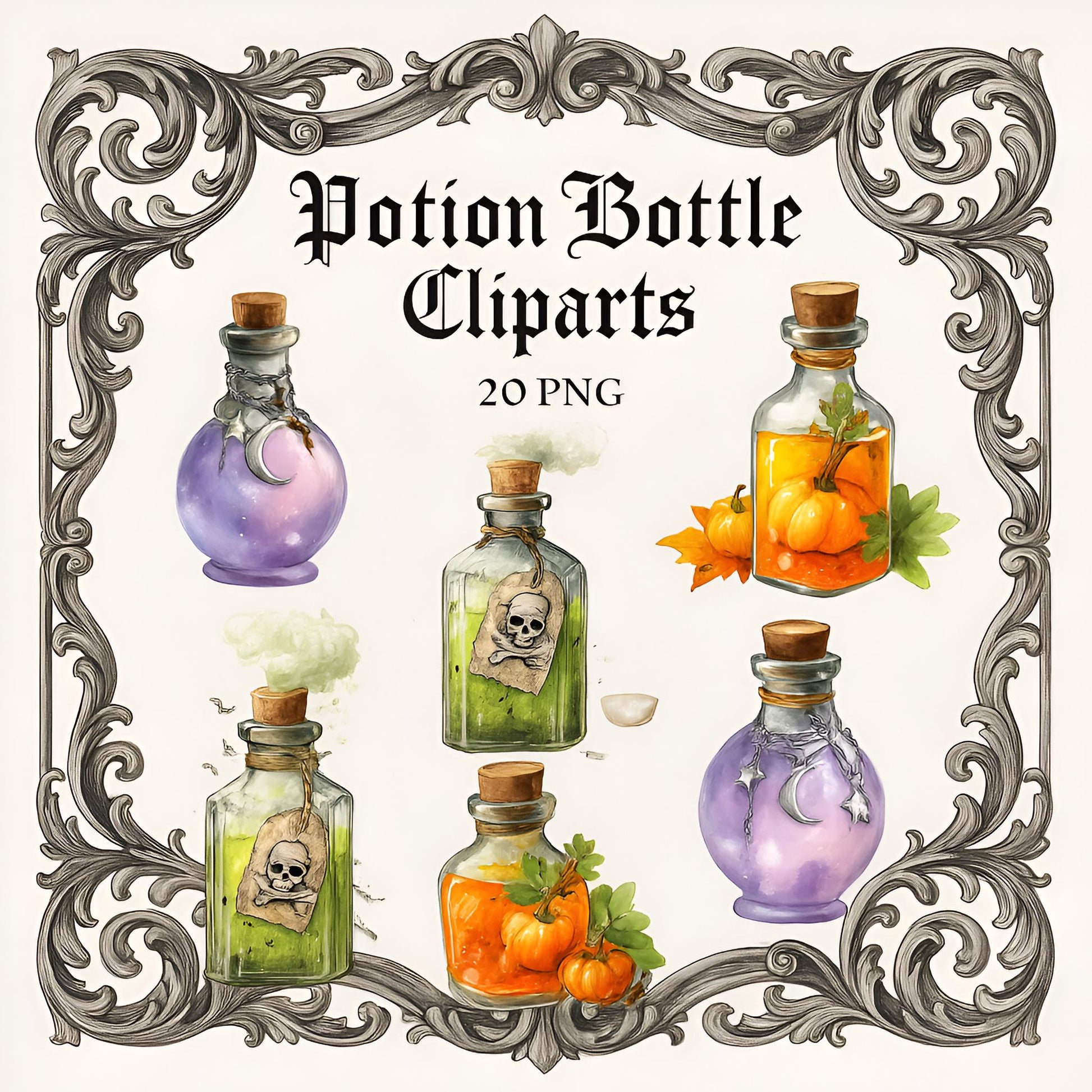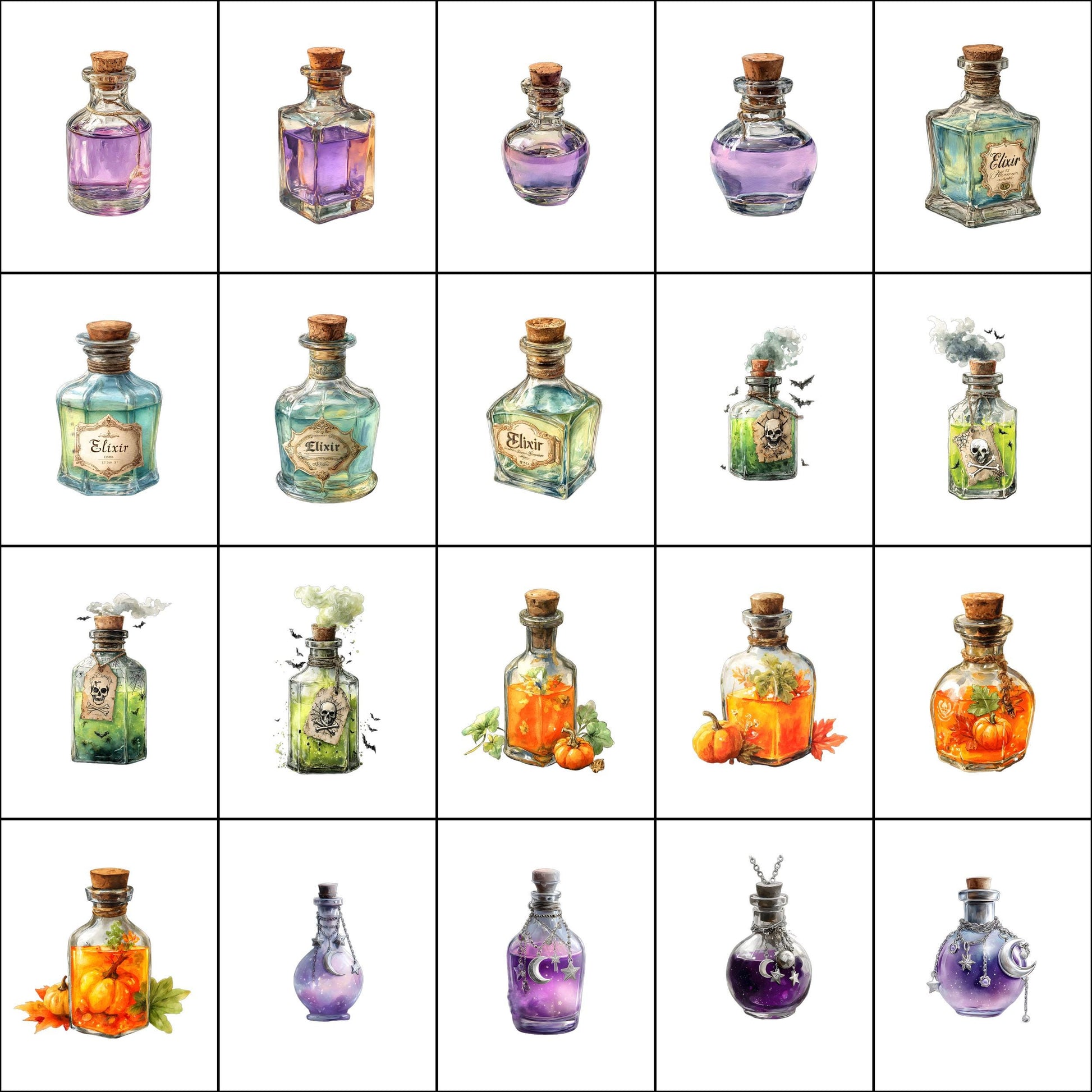 Watercolor Potion Bottles Clipart Set: Halloween Magic, 20 PNG (Instant Download)