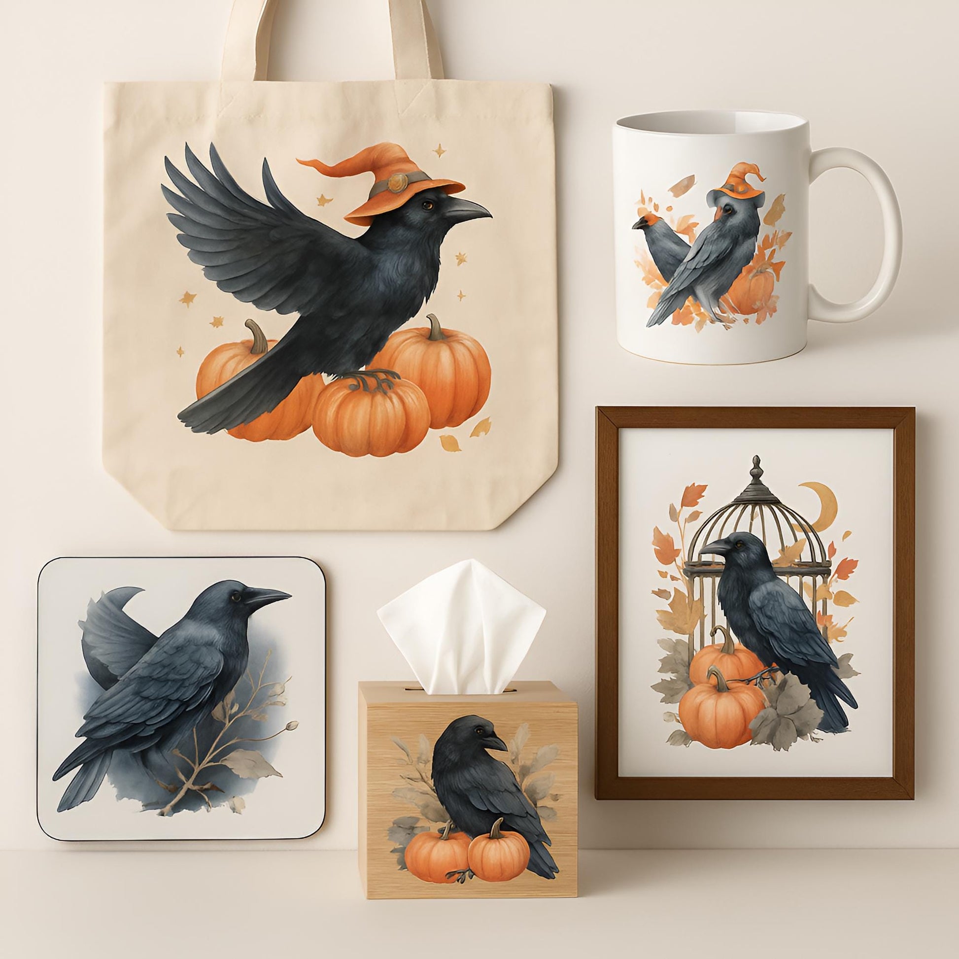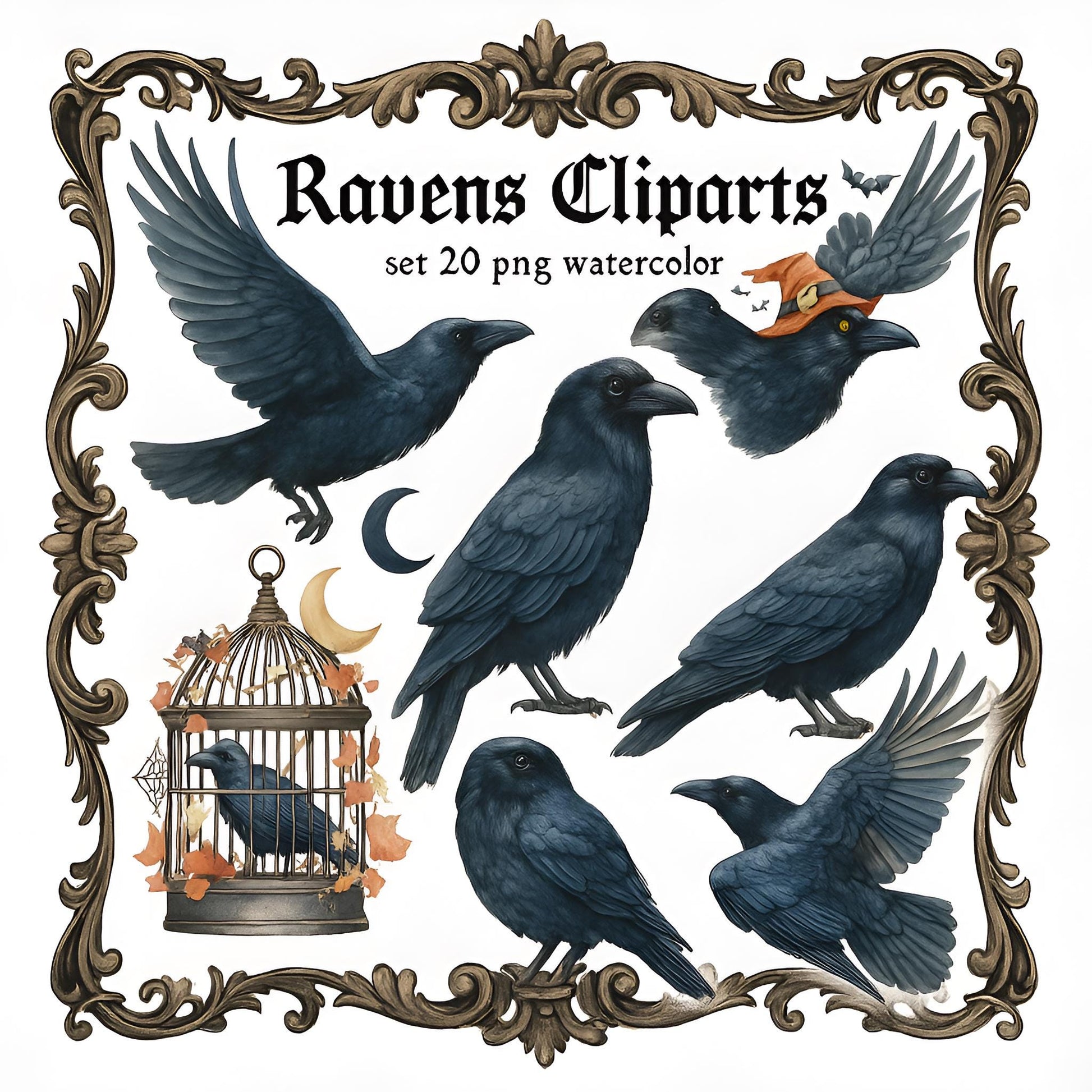 Watercolor Raven Clipart Set: Gothic Halloween Birds (Instant Download, 20 PNG, 300 DPI)