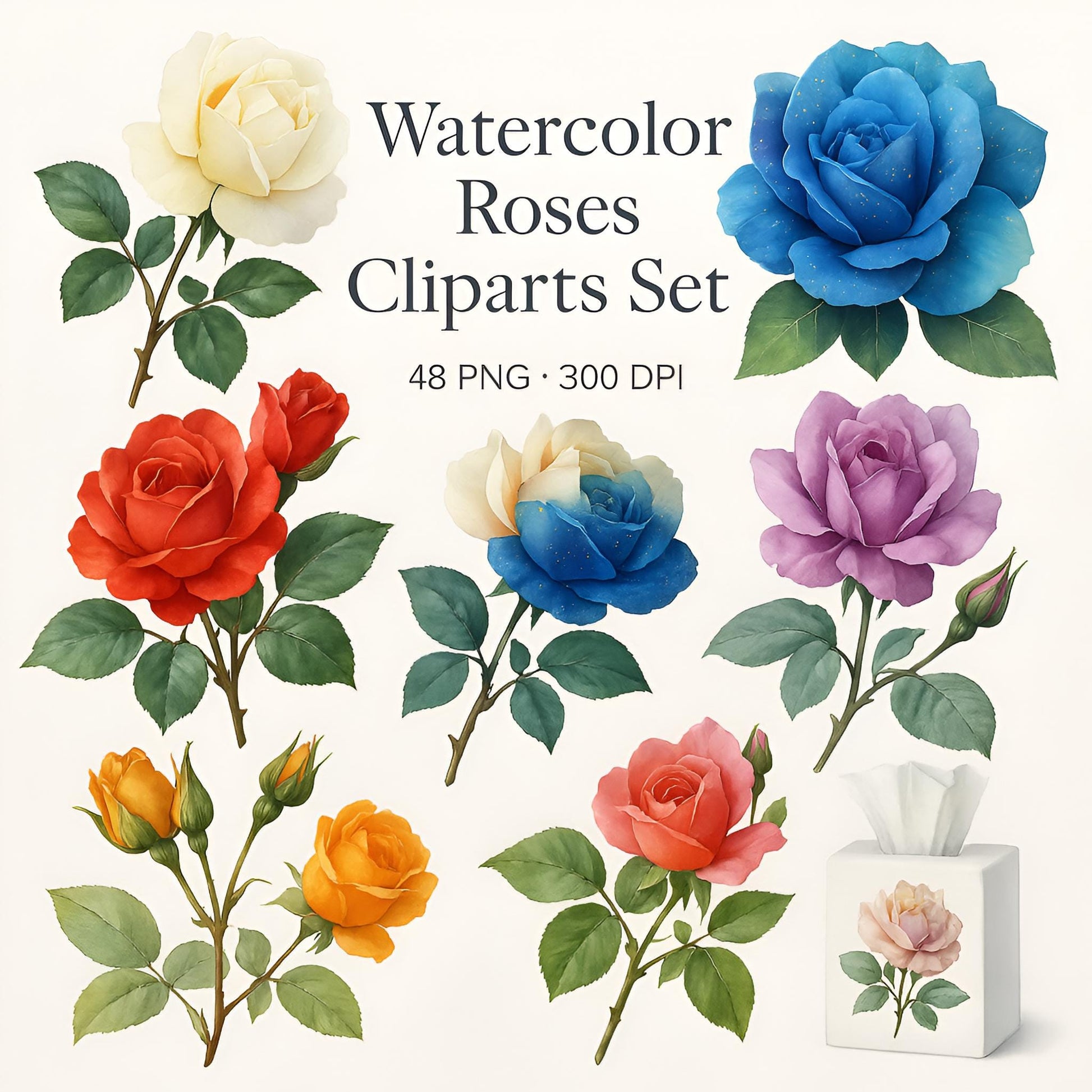 🎨 Watercolor Roses Clipart Set – 48 PNG – 300 DPI, Transparent Background