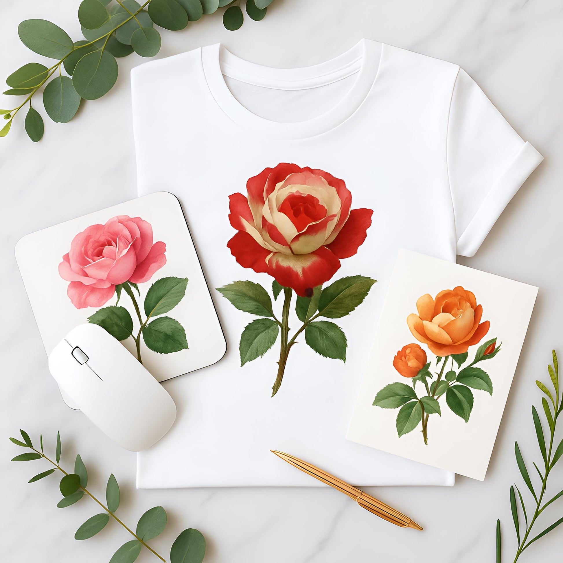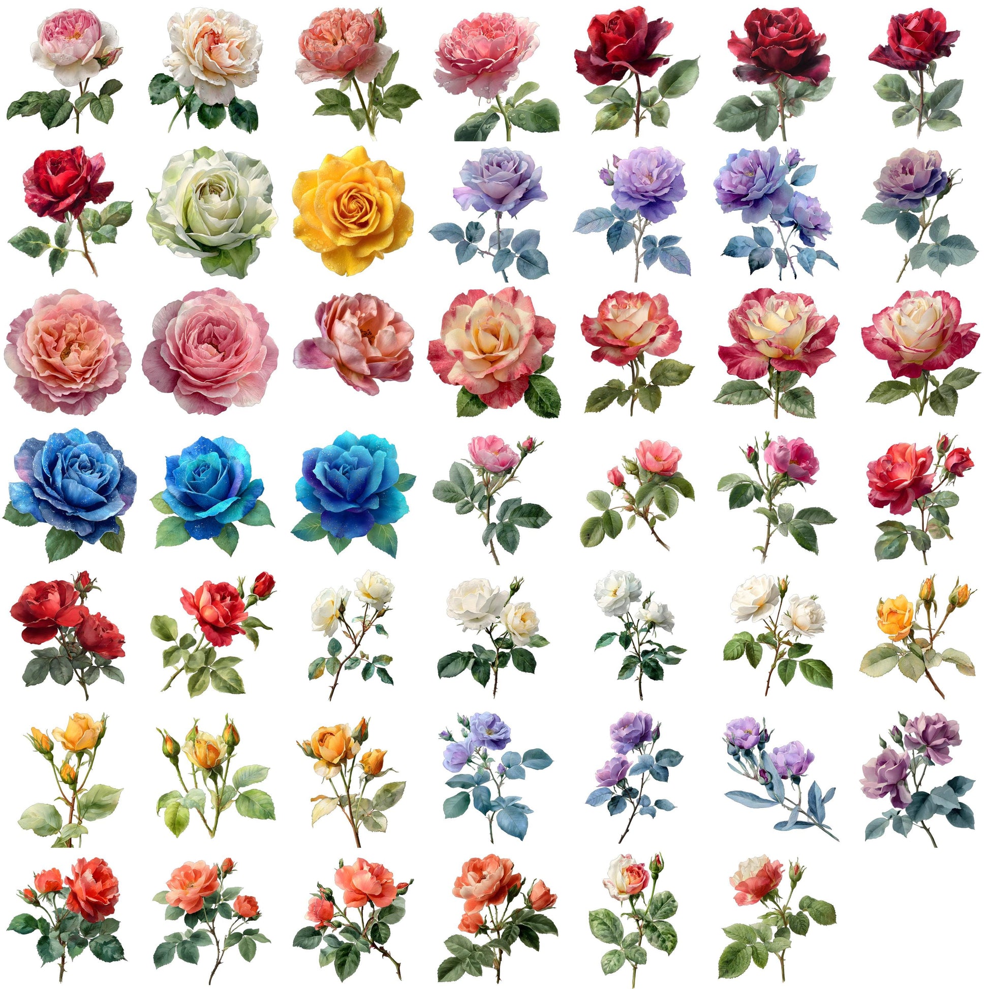 Watercolor Roses Clipart Set: 48 PNG Designs with Transparent Background