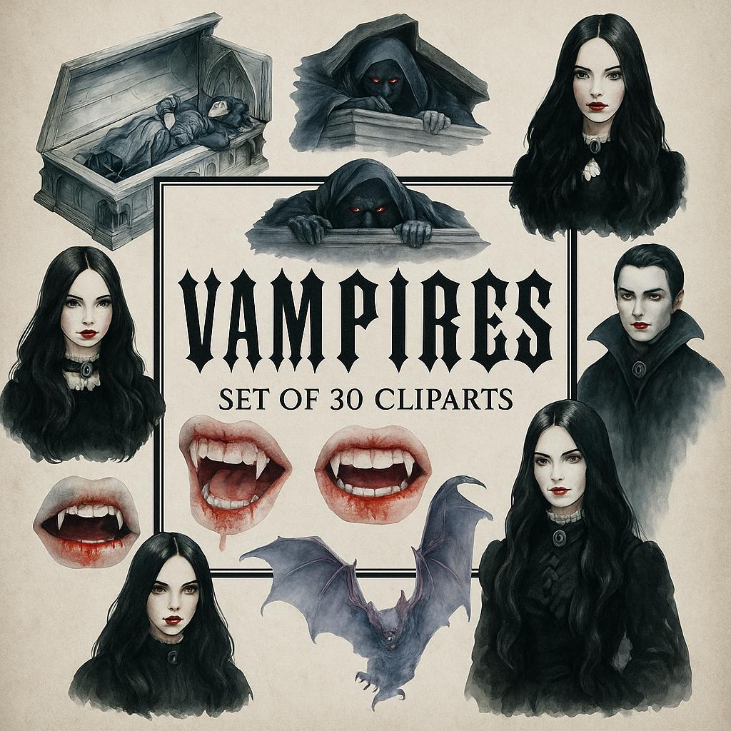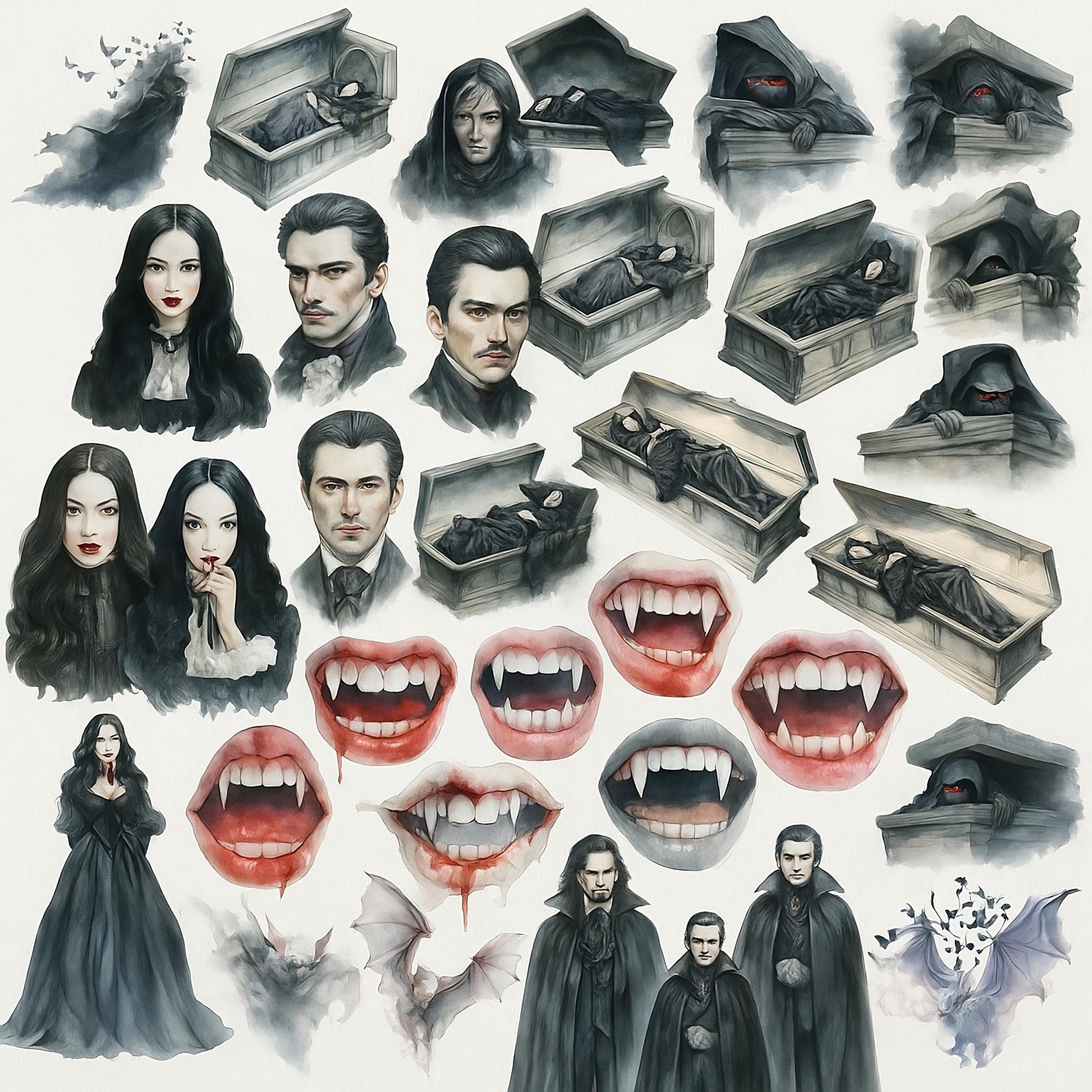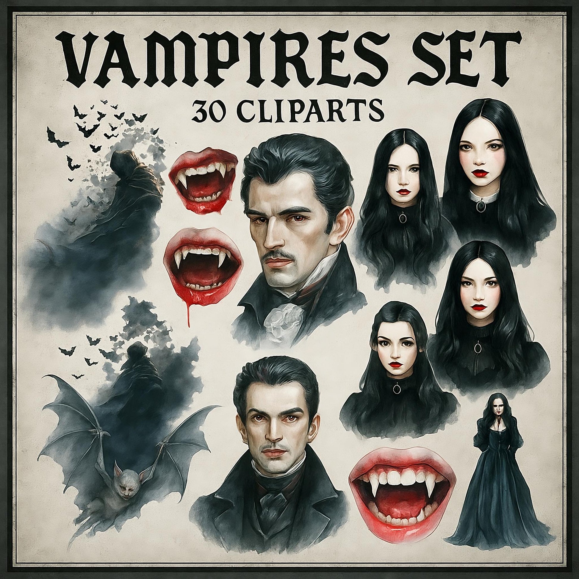 🎨 Watercolor Vampire Clipart Set – 30 PNG – 300 DPI, Transparent Background