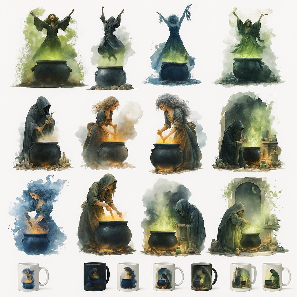 π¨ Watercolor Witch with Cauldron Cliparts β 16 PNG Watercolor Illustrations β Halloween Witches, Transparent Background, High Resolution Clipart Set β 16 PNG β 300 DPI, Transparent Background