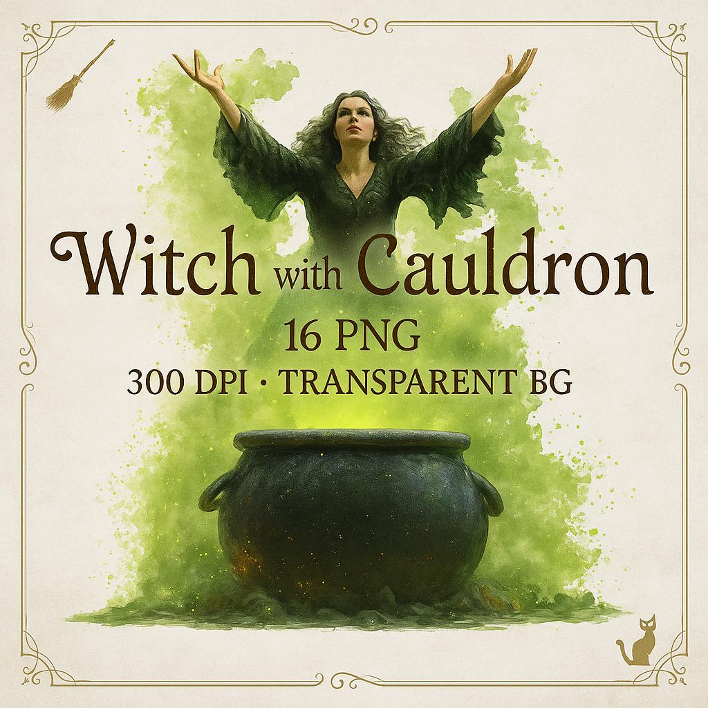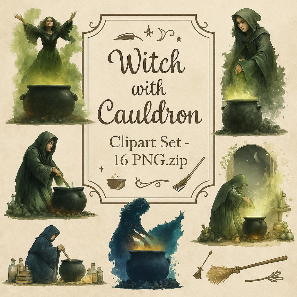 Witch with Cauldron Cliparts β 16 PNG Watercolor Illustrations β Halloween Witches, Transparent Background, High Resolution